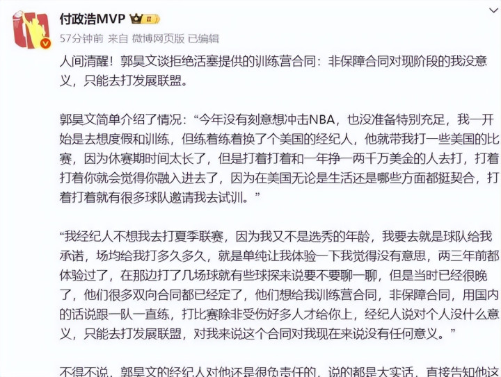 小郭在采访中一句话把原因说清楚:“那个合同没有保障,只是训练营合同,只能去打发展联盟,很难在正赛登场亮相。”